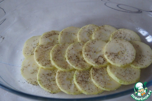 На дно сотейника плотно выложить кружочки кабачка, присолить и поперчить немного.