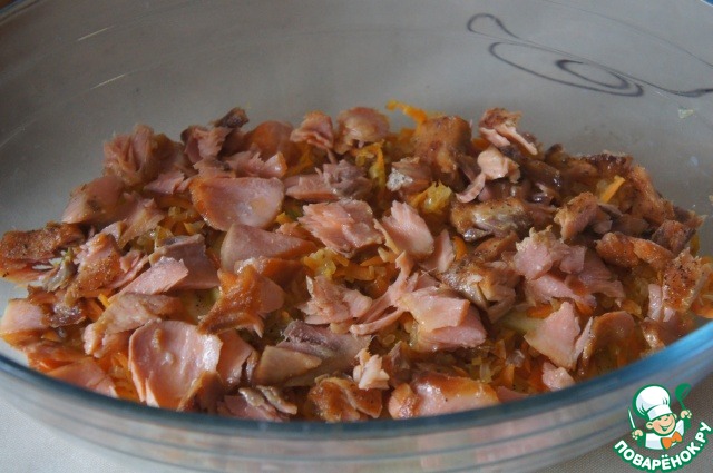 Затем половину овощно-грибной смеси. Затем выложить половину кусочков рыбы.