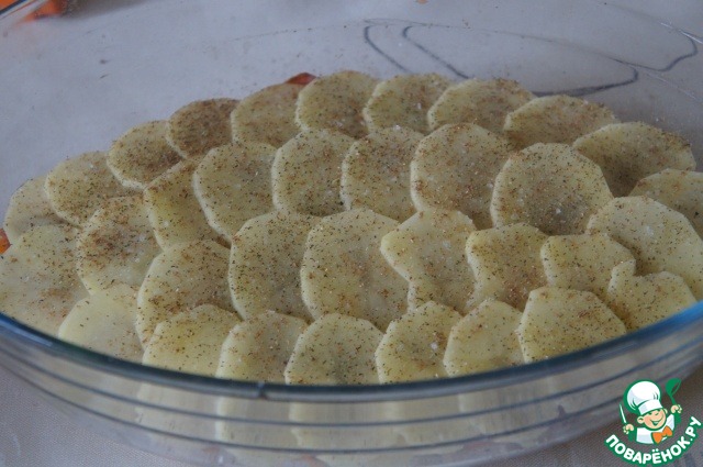 затем вторую половину рыбы, на нее оставшуюся овощно-грибную смесь. Сверху выложить пластинки картофеля в виде чешуи.