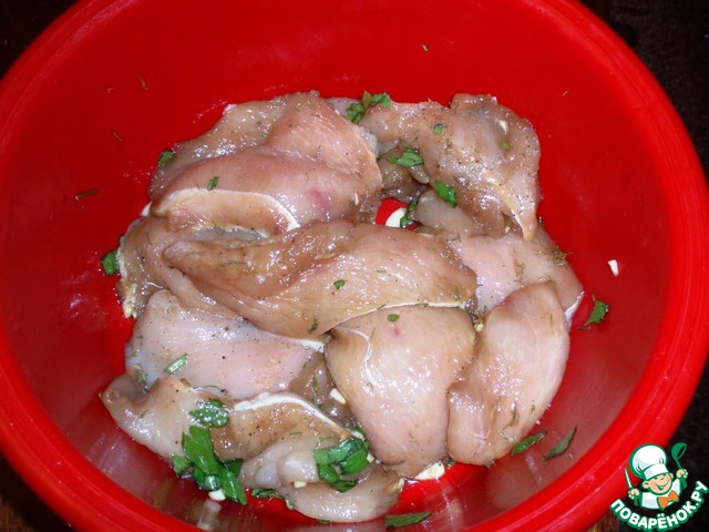 Куриные грудки порезать пополам вдоль, таким образом у нас получится 4 кусочка. Замариновать грудки в соевом соусе с добавлением порезанного чеснока и зелени.