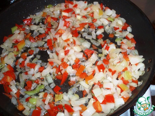 Пока грудки маринуются, мы чистим и нарезаем на кубики болгарский перец и лук. Затем обжариваем их на растительном или оливковом масле.