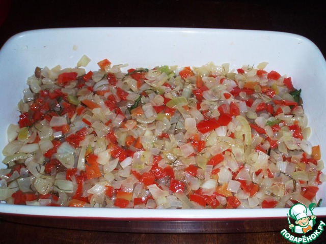 Грудки перекладываем в керамическую форму для запекания, кладём плотно, чтобы между кусочками не было просветов. Покрываем уже выложенные грудки зажаркой из лука и перца, немного солим или посыпаем универсальной приправой.