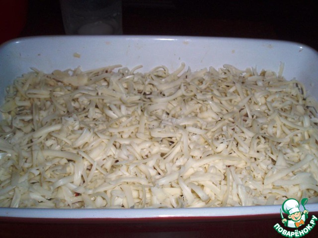 Трём сыр на крупной тёрке и посыпаем им наше творение.