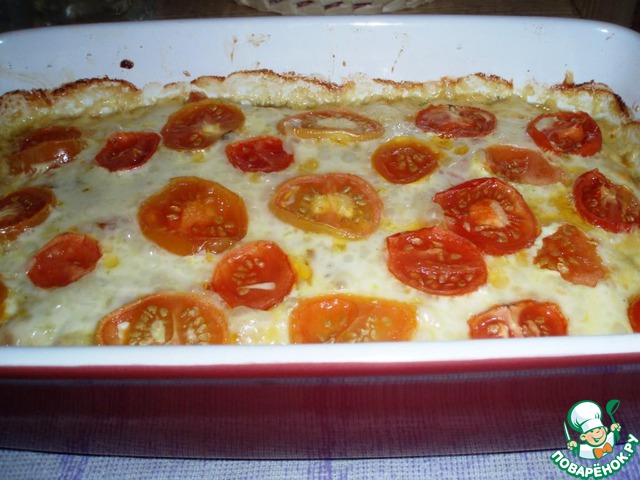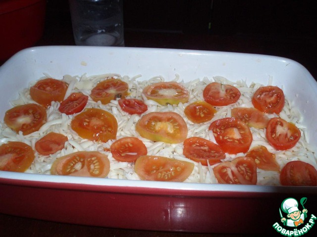 Сверху на сыр выкладываем порезанные кружками помидоры и отправляем форму в разогретую до 200 градусов духовку на 30-40 минут.