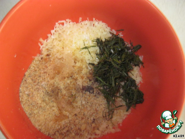 Смешиваем в миске мелко нарубленный 1 зубчик чеснока, тертый твердый сыр, панировочные сухари, соль, зелень, перец.