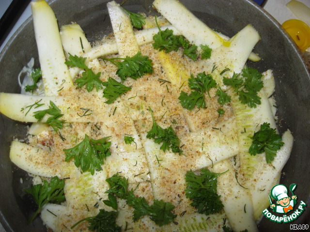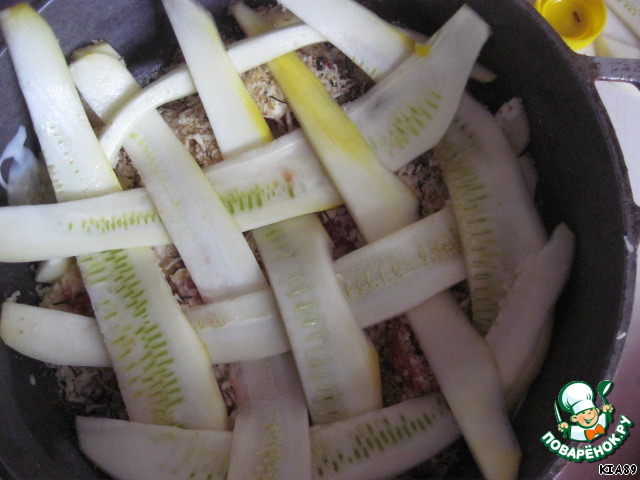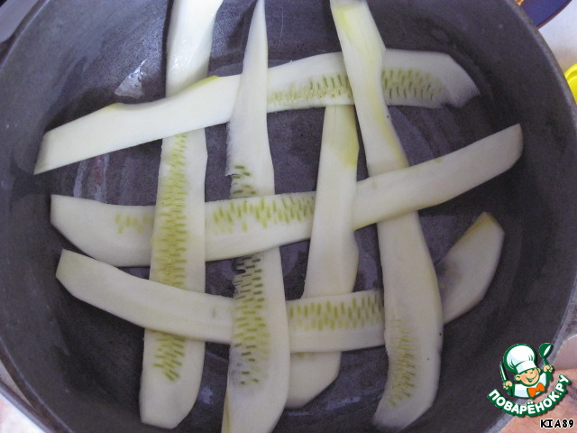 Форму слегка смазать растительным маслом. Предварительно вымытый и очищенный от кожуры кабачок, нарезанный тоненькими ломтиками, на досочке выкладываем плетенкой (так удобней) и переносим в форму.