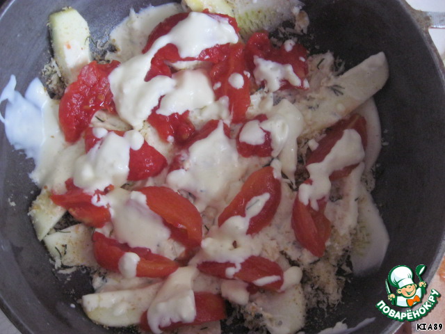 Добавляем нарезанные помидоры. И выливаем на них оставшийся соус.