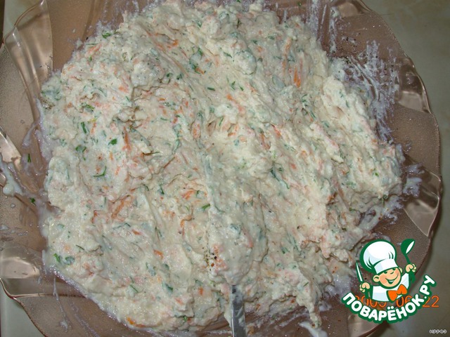 Смешать творог, морковь, зелень, яйцо и сметану.