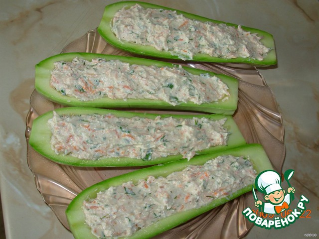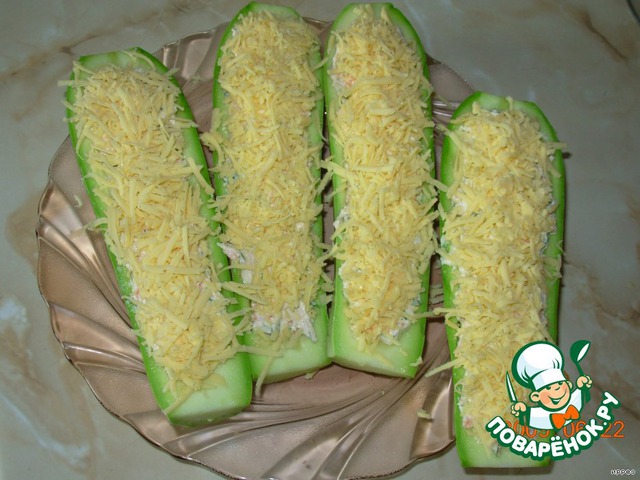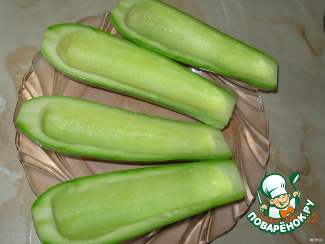 Кабачки помыть, отрезать плодоножки, разрезать пополам и ложкой вытащить мякоть, так, чтобы образовались "лодочки".