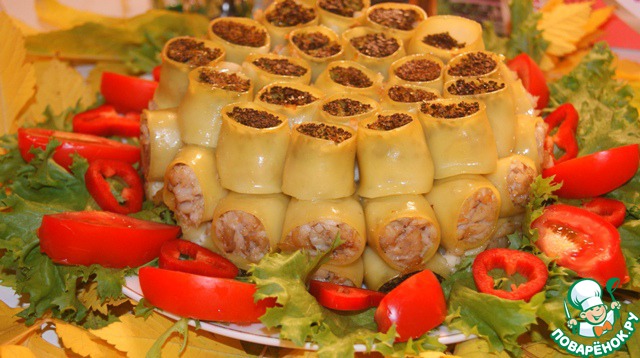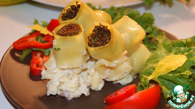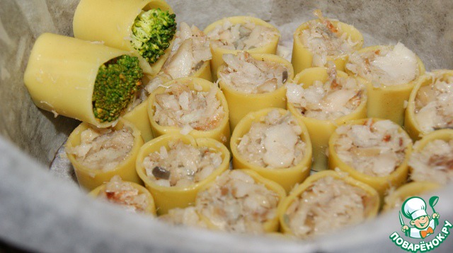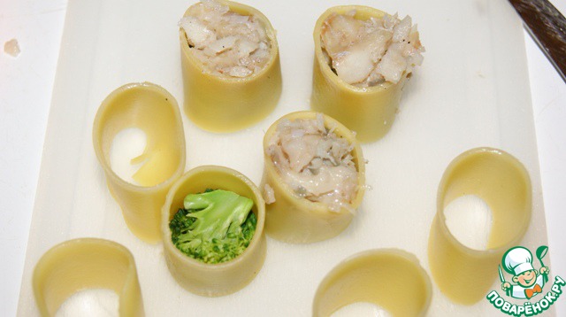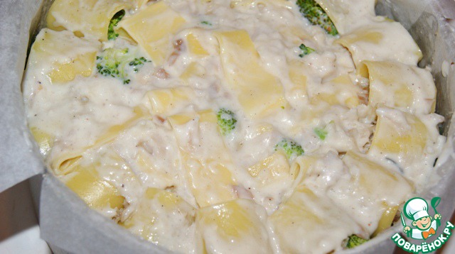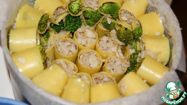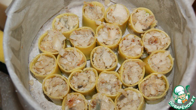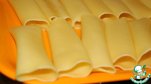 Каннеллони - каждую разрезать на четыре части. Для "донышка" мне понадобилось 21 шт.