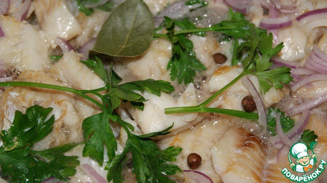 обжарить небольшие кусочки рыбного филе по 1-2 мин., добавить петрушку, душистый перец, лук и лавровый лист, загасить вином, убавить огонь и тушить, накрыв крышкой, 10 минут.