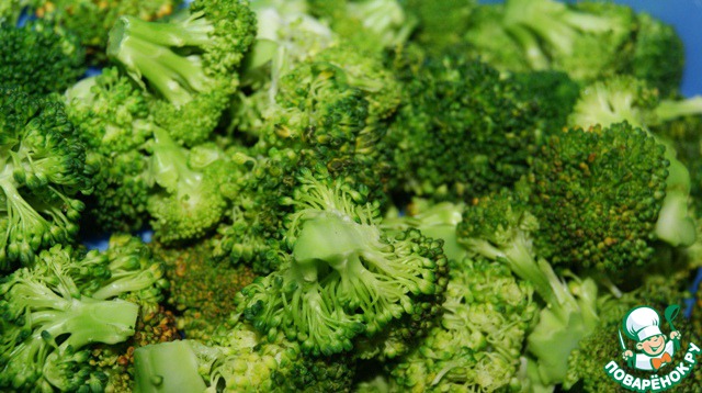 Брокколи отварить на пару, я делала это в СВЧ на мощности 800, поместив соцветия в пищевую плёнку.