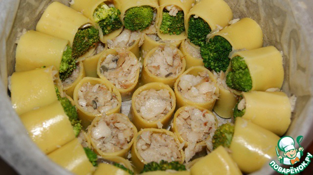 Разместить трубочки перпендикулярно дну формы соцветиями брокколи вниз, а рыбой вверх. Вот так.