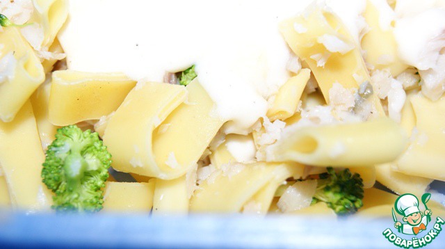 Смешать оставшуюся пасту (нарезать по 1 см), рыбу и бешамель, если останется, то и брокколи.