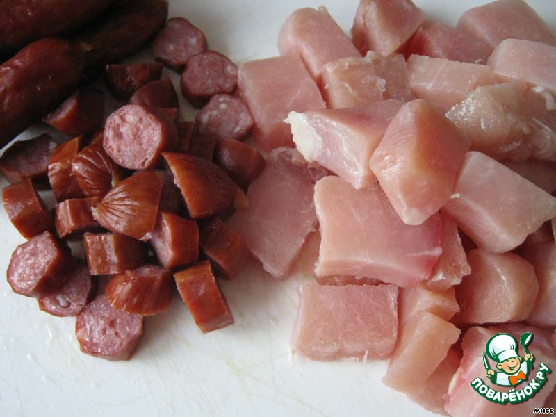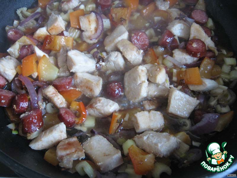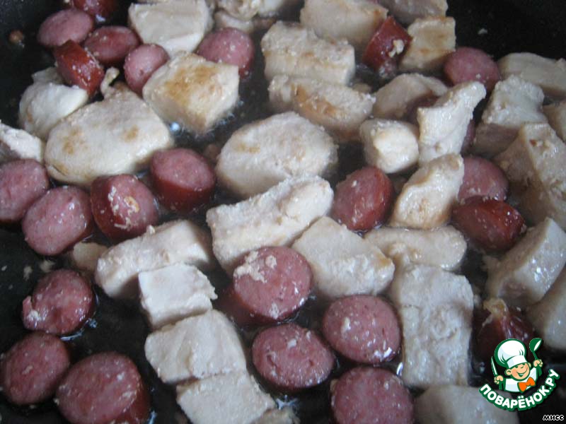 На сковороде с растительным маслом обжарим куриное филе до румяной корочки (около 10 минут), затем добавим колбаски и прожарим ещё пару минут.