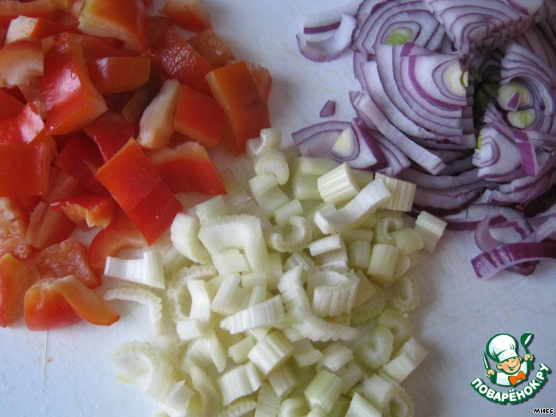 Нарежем мелко красный лук, кубиками сладкий красный перец и покрупнее сельдерей.
