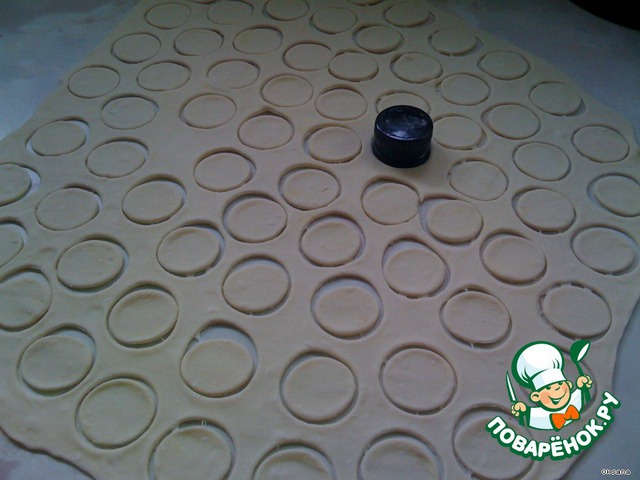 Приготовить тесто обычным способом, я все делаю на глаз, насыпаю горку муки, делаю ямку туда вбиваю яйцо, посолю, и размешиваю, далее добавляю воды и довожу тесто до нужной мне консистенции.Раскатать и пробочкой от масла выдавить кружочки.