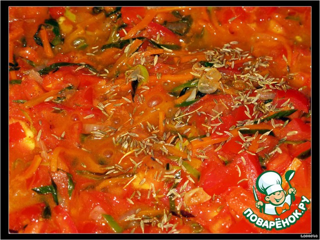 Затем прогреть на сковороде (5 минут) с добавлением мелко нарезанного чеснока. Для более насыщенного вкуса и остроты я добавила еще томат-пасту, разведенную в 150 мл воды. Если соус получается слишком густым, то его можно разбавить овощным бульоном или просто водой.