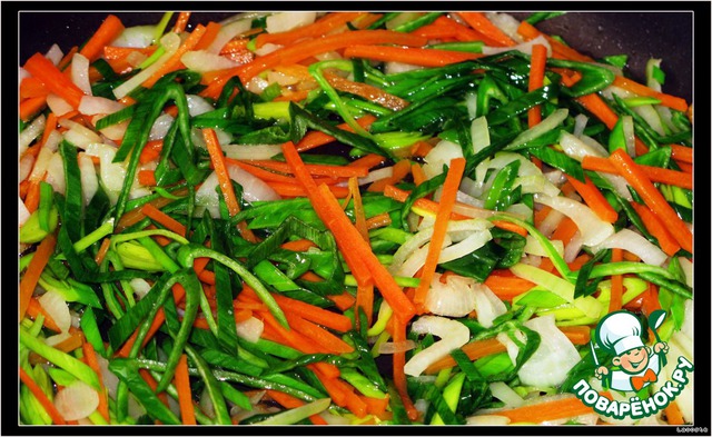 Обжарить на растительном масле лук-порей, морковь и репчатый лук до золотистого цвета.