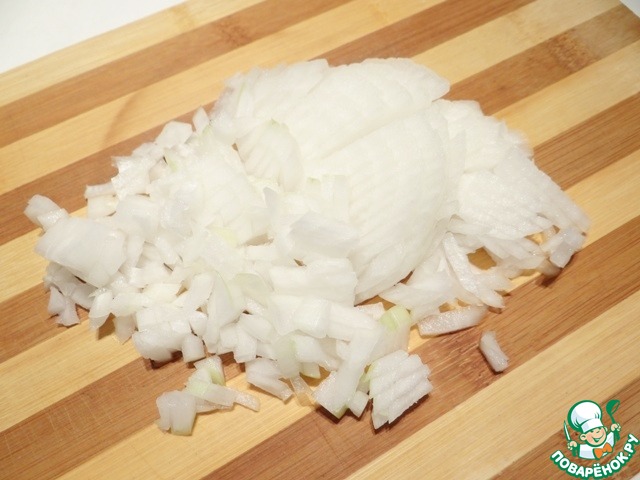 Теперь приступаю к приготовлению ризотто. Репчатый лук чищу, мою и нарезаю мелко на кубики.