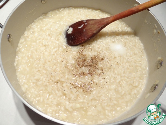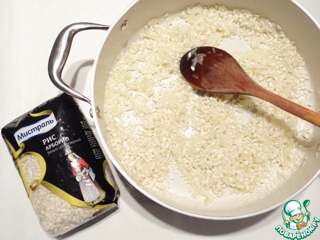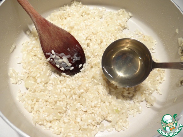 Обжариваю рис, пока он не впитает масло. Добавляю вино, оставляю рис готовиться, пока полностью не впитается вино.