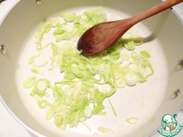 Обжариваю лук-порей на оливковом и сливочном масле до мягкости.