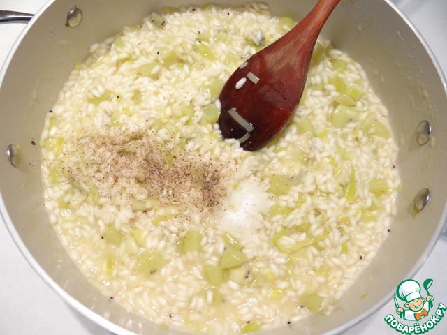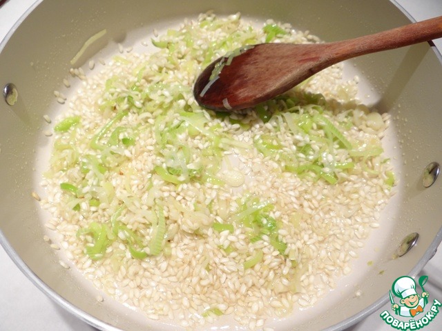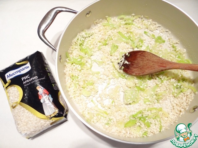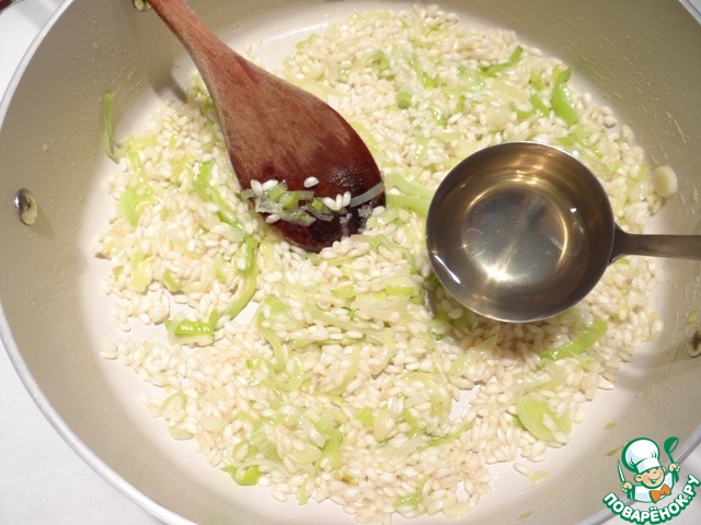 Помешивая, обжариваю рис, пока он не впитает все масло. Вливаю сухое белое вино и готовлю рис на среднем огне, пока вино полностью не впитается.