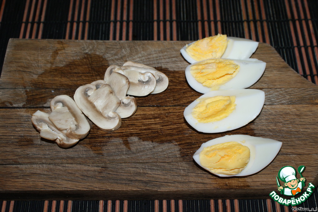Далее укладываем дольки шампиньона, сверху - 1 ст.л. печени.