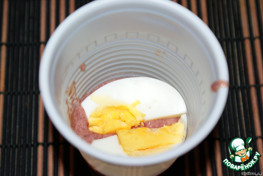 Пенечки я делала в обычном пластиковом стакане. На дно стаканчика выкладываем 1 ст.л. печени.
