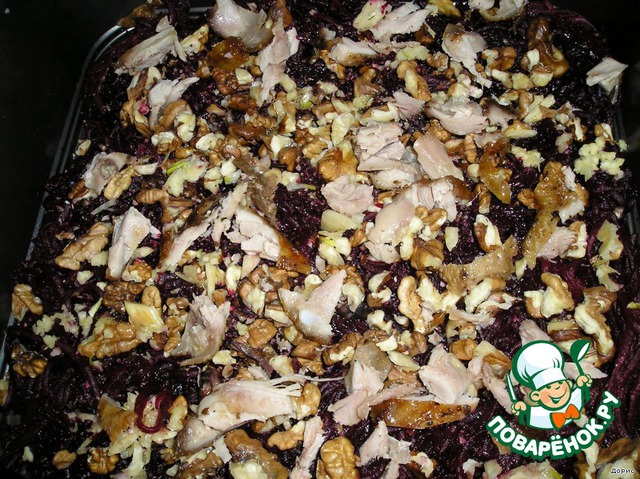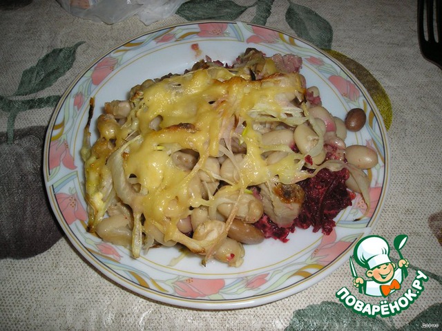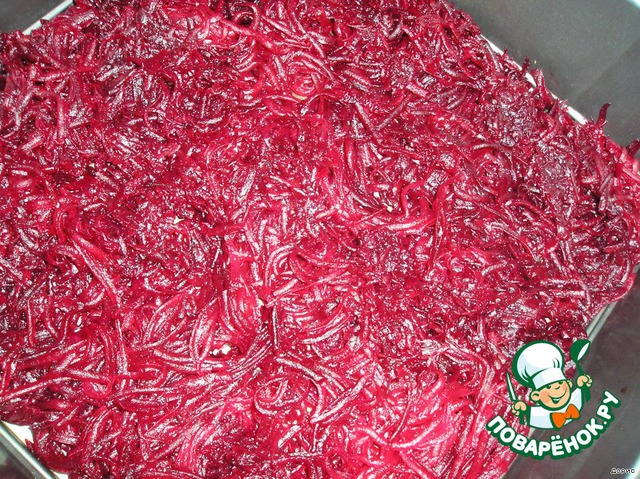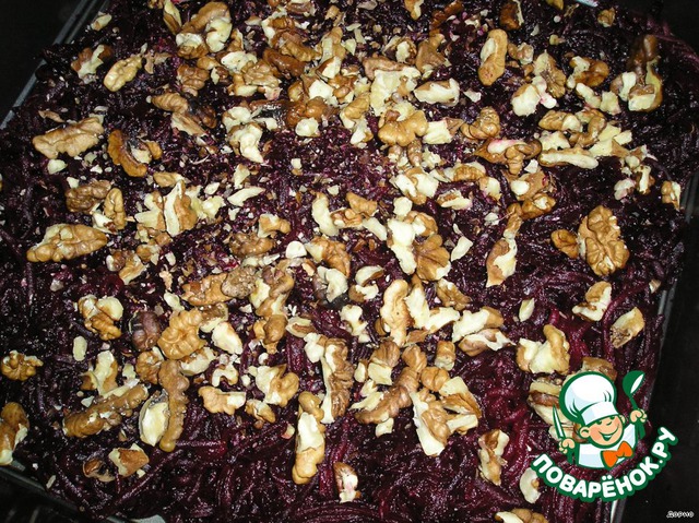 Буряк натираем на крупной тёрке и выкладываем в форму для запекания.