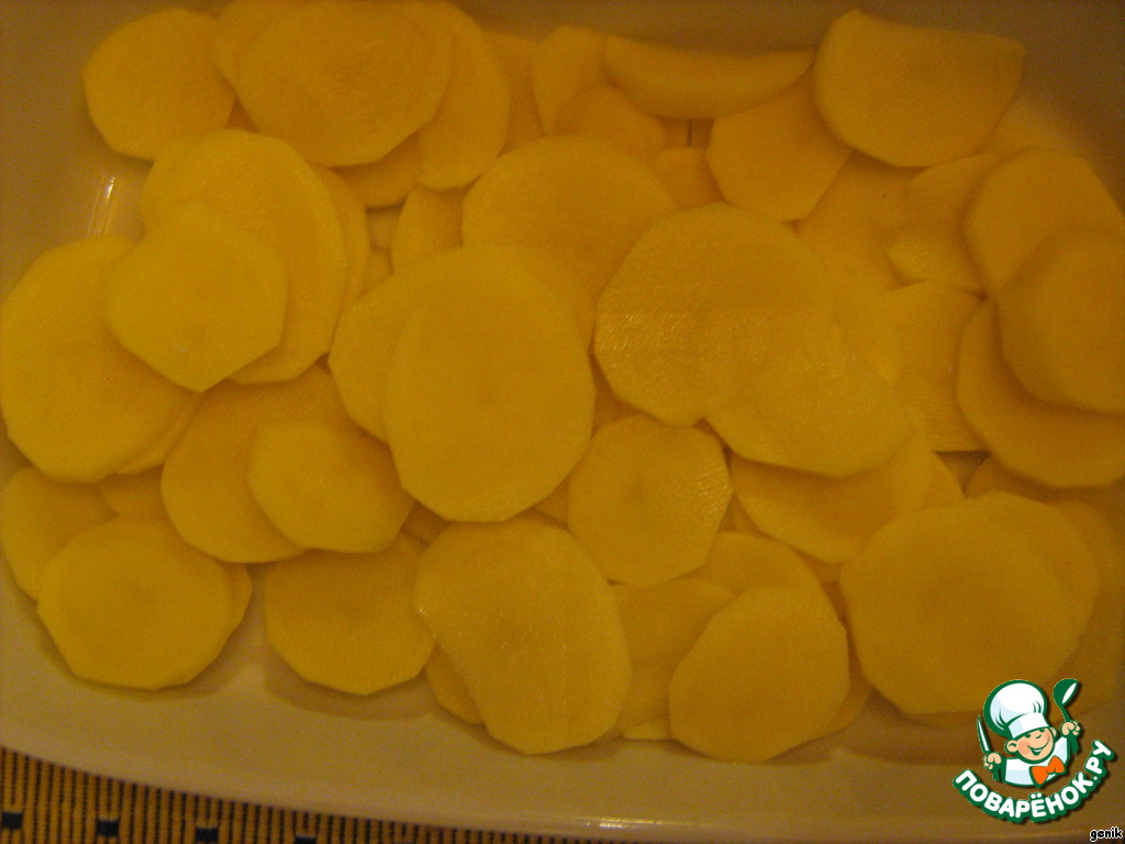 Картошечку чистим и режем ломтиками 0.5 см. Выкладываем в форму.