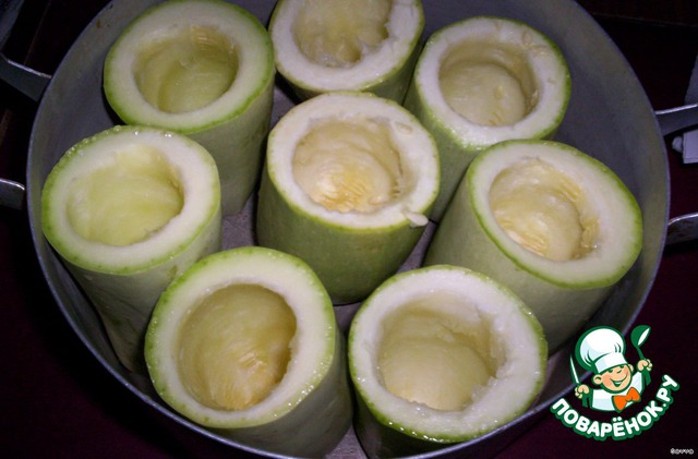 - нафаршировать кабачки мясом , луком, морковью, перцем кабачки , на дно кастрюли налить горячей воды (4 -5 см. ), посолить поперчить.