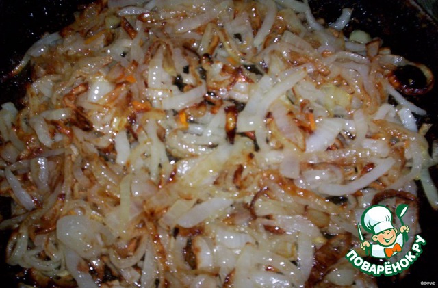 - поджарить на подсолнечном масле до золотистого цвета лук , наклонить сковородку что бы удалить излишки масла.