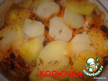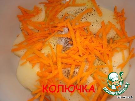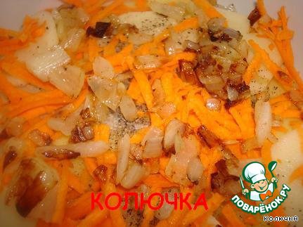 Итак, слой картофеля + специи + соль + морковка + лучок