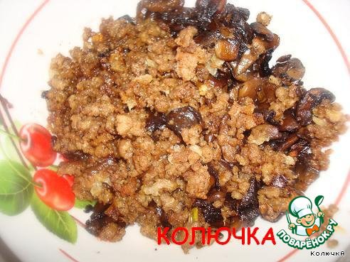 Фарш обжаренный и грибочки уже были готовы, а с ними и лучок золотистый
