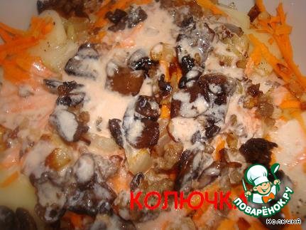 Сверху мяско + грибочки и заливочка (сметанка + соус)