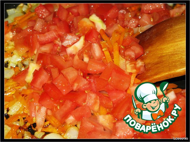 Помидор нарезать небольшими кубиками, добавить к овощам и обжаривать ещё около 5-7 минут.
