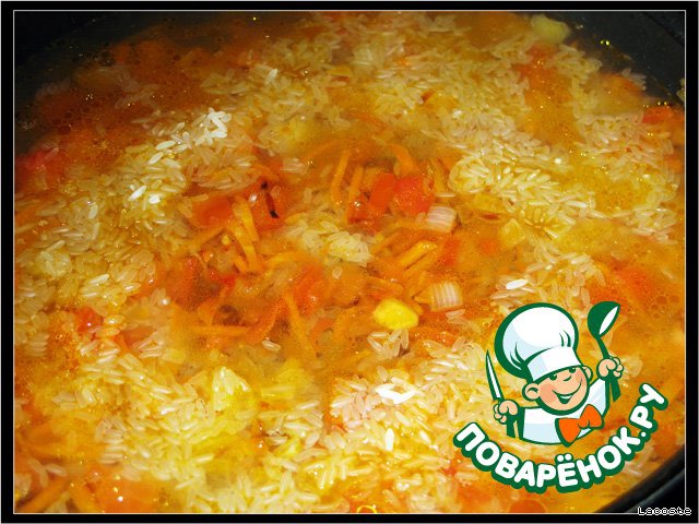 Засыпать рис и влить бульон, посолить, перемешать, накрыть крышкой и, убавив огонь, готовить около 15-20 минут, до испарения жидкости.