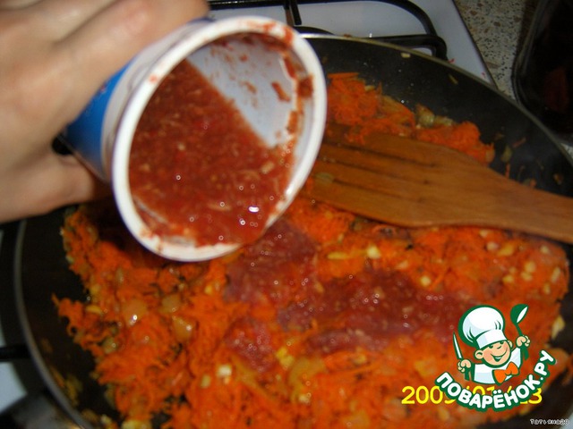 Обжариваем на сковороде лук, морковь, добавляем чеснок и в последнюю очередь хреновину. Тушим несколько минут. Выключаем.