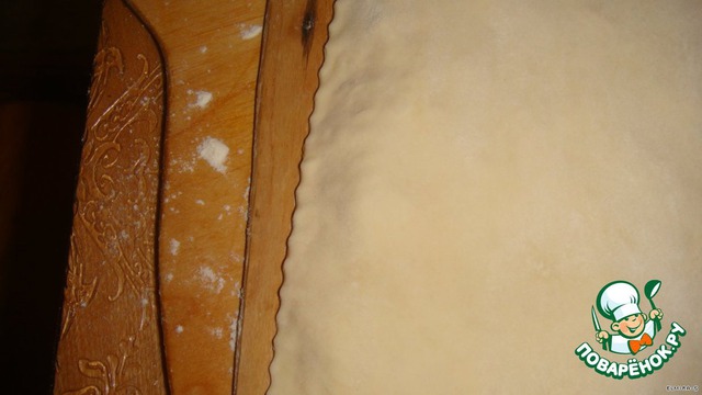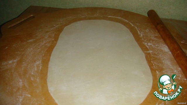 Переложите пласт на маленькую доску, на одну часть пласта положите начинку,