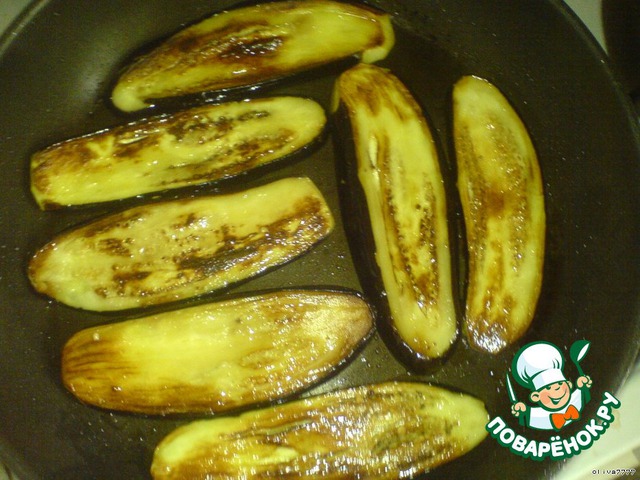 Баклажаны нарезать вдоль и обжарить на растительном масле с двух сторон.