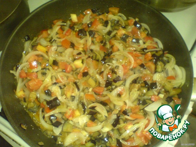Грудку куриную отварить и порезать мелко. Порезанный лук, помидоры и баклажаны (можно обрезки краёв и любые нестандартные) обжарить на растительном масле.