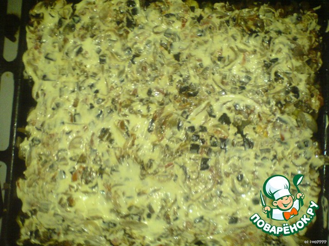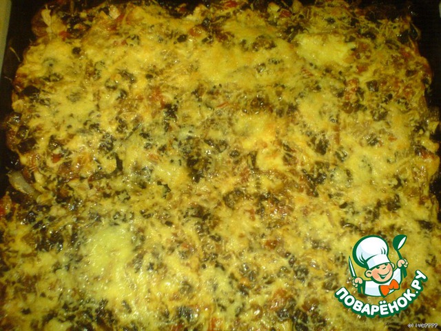 Поставить в разогретую духовку на 10-15 минут. Достав чуть посыпать сыром и ещё подержать в духовке минут пять.