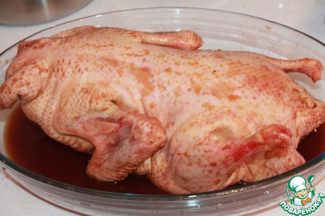 | Утка или гусь, прекрасное блюдо праздничного стола. Секрет успеха маринад, который в данном рецепте на основе соевого соуса. А начинкой для нашей уточки послужат ягоды. |
