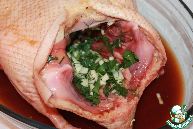 Внутрь утки кладем чеснок и зелень и оставляем мариноваться не менее чем на 12 часов. Периодически переворачиваем утку.