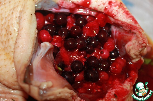 После того как наша уточка замариновалась, внутрь тушки кладем подсоленную ягодную смесь. Зашиваем нашу утку в районе гузки и шеи. Отправляем в духовку на 200 - 220 гр. на 1, 5 часа укрыв утку фольгой, а затем еще на 1 час сняв фольгу, до готовности.