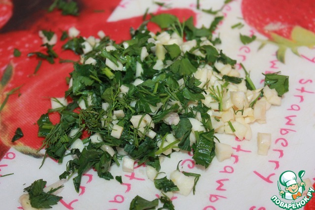 Мелко нарезаем зелень и чеснок. У меня петрушка и укроп.