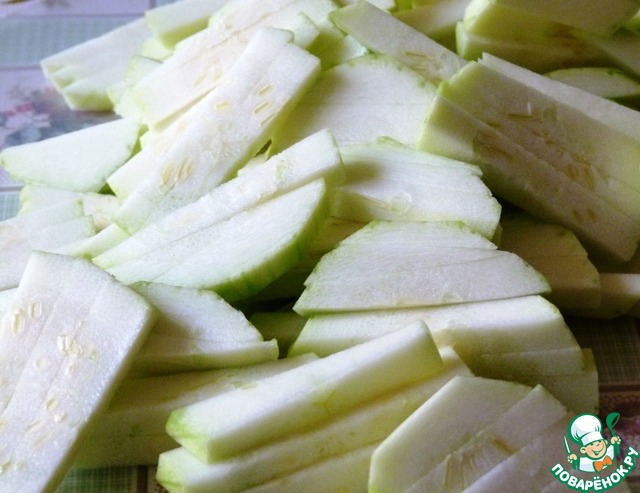 Кабачки помыть, почистить и нарезать брусочками.