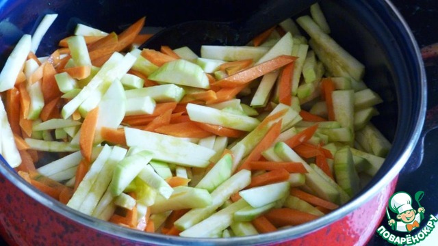 Я использую широкую кастрюлю. Ставим на огонь. Немного растительного масла (кстати можно его не использовать, овощи дадут сок). Выкладываем наши овощи. Чуть присолить. Перемешать. И оставить под закрытой крышкой мин на 10-15. Огонь убавить на средний.