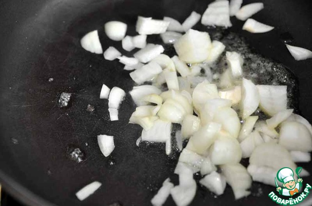 На сковороду кладём сливочное масло и обжариваем 2 минуты лук.